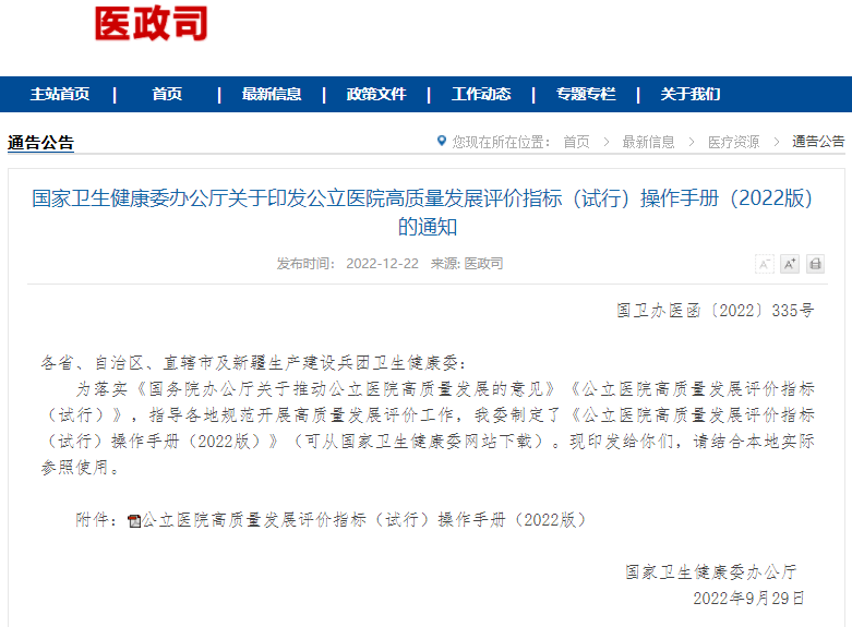 12月22日,国家卫生健康委发布了《公立医院高水平质量的发展评价指标(试行)操作手册(2022版)》(简称《操作手册》),推动公立医院高水平质量的发展。