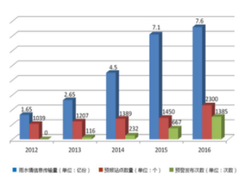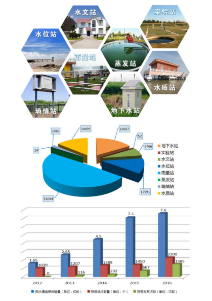 信息体量不断增大。通过对水位、流量、降水量等要素的监测分析,对水资源的量、质及其时空变化规律的研究,水文工作在工程规划建设、最严格水资源管理以及水生态文明建设等方面发挥了无法替代的及其重要的作用。近年来,水文部门积极整合共享中小河流水文监测系统等项目新建站点的信息资源,加强基础数据建设,防汛关键期加密信息报送频次,丰富水情信息,实现中央和地方实时信息数据全面共享。2016年,各流域、省级水文部门向国家防总报送雨水情信息7.6亿条,关键预报准确率超过95%、预见期延长至7天。