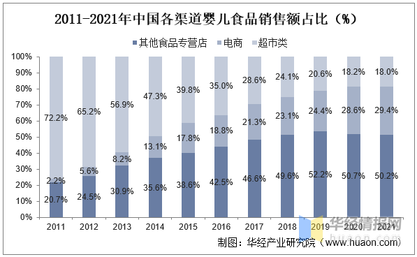 从下游销售经营渠道来看,自2019年起其他食品专营店在婴儿食品的零售销售额占比即超过50%,并保持该趋势至今,截至2021年该渠道销售占比略有下降,但仍高达50.2%。电商渠道销售额占比逐年上涨。