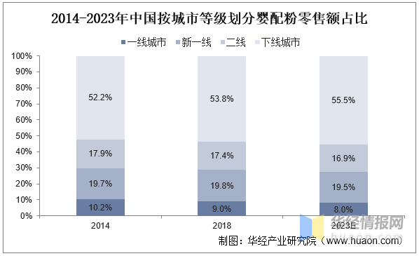 1、下线年下线城市的市场占有率在我国婴配粉零售额占比达到53.8%,且是各统计类别城市中唯一一类市场占比显著提升的。相比而言,一线城市、新一线城市以及二线城市在同期的份额占比分别为9%、19.8%和17.4%。相较2014年,一线年的市场占有率占比基本均在下降。预计未来下线城市婴配粉具有一定发展空间。
