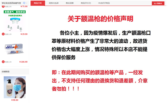 掌亿发达医药保健专营店售卖的爱立康额温枪有现货,但也是捆绑防护口罩或免洗洗手液进行销售,价格六七百元不等。店铺称,不能单买,因疫情暴发后额温枪等原材料价格产生了非常大的波动,故进货价格也大面积上涨,店铺不能提供保价服务。记者询问涨价幅度,店家并未公开回应,只称拍的多少钱就是多少钱。