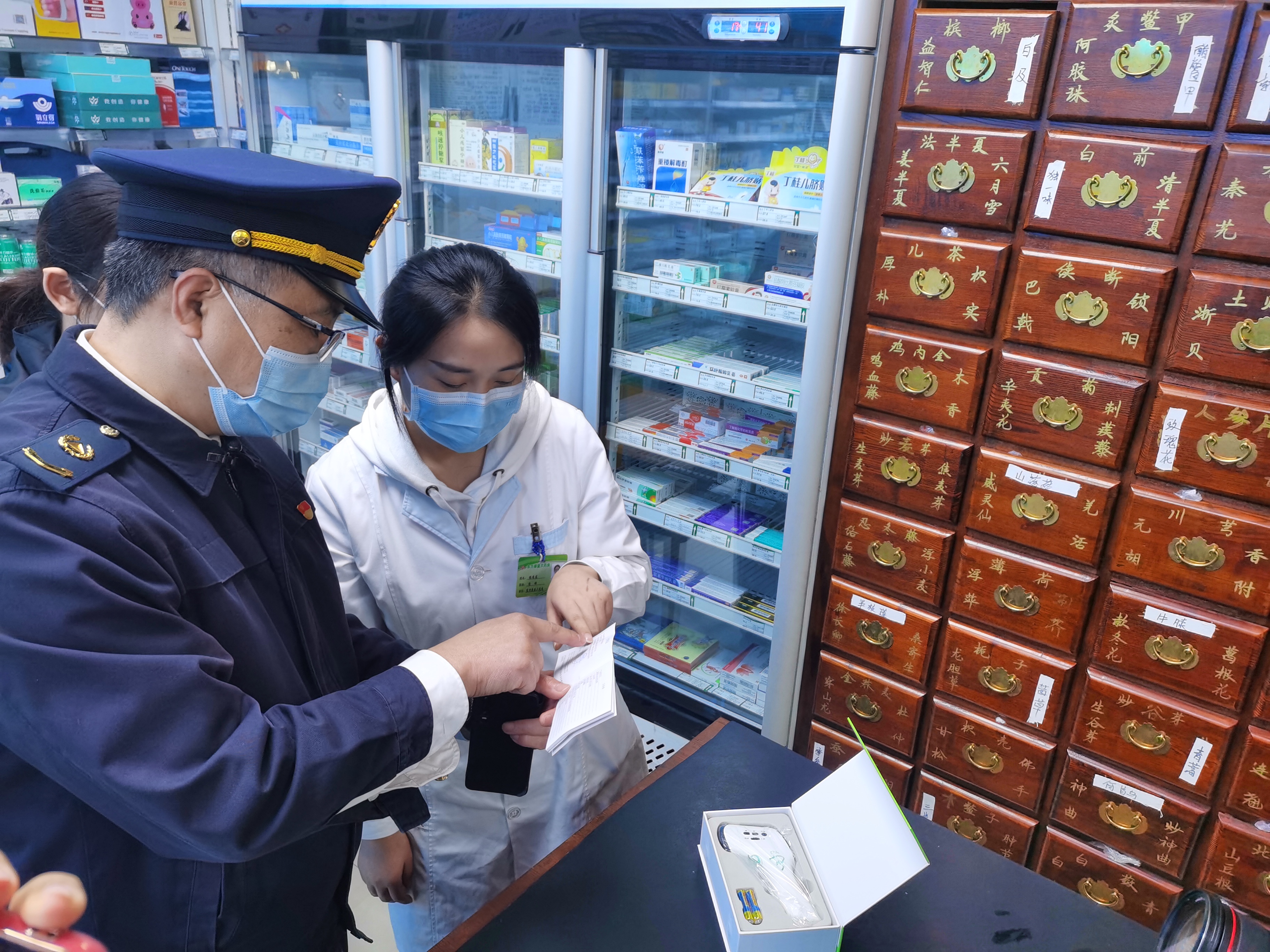 在大悦城地下一层一家药店,执法人员查看了测温仪器的进货票据,出厂合格证书等,“咱们药店在售的测温仪共有几款?日常销售情况如何?保存环境如何?”药店工作人员介绍:“我们店一共有两款测温仪,都是手持红外线的,全部有票据和合格证书,店内温度也符合产品要求。”
